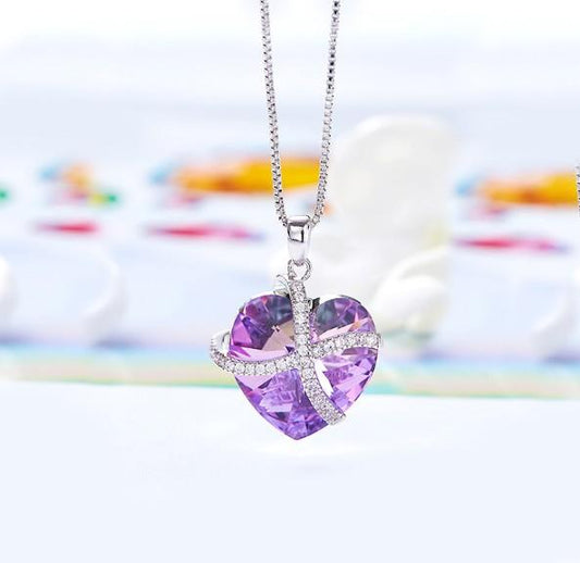 Iridescent Amethyst Gemstone Crystal Rose Heart Necklace in 14K White Gold Plated