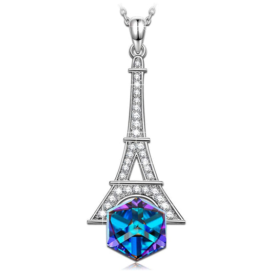 Blue Cubic Zirconia Eiffel Towel Pav'e Necklace in Rhodium Plating